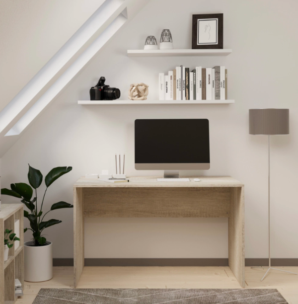 Escritorio de madera con estantes flotantes blancos. Espacio funcional y ordenado, ideal para trabajar desde casa con estilo.