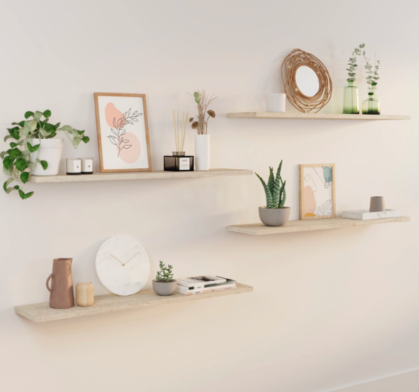 Conjunto de cuatro estantes decorados con plantas, cuadros y objetos de diseño. Aportan calidez y personalidad a cualquier pared.