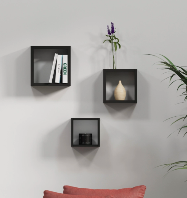 Juego de tres estantes cuadrados en disposición triangular. Una propuesta moderna para decorar paredes con libros, jarrones y objetos de diseño.
